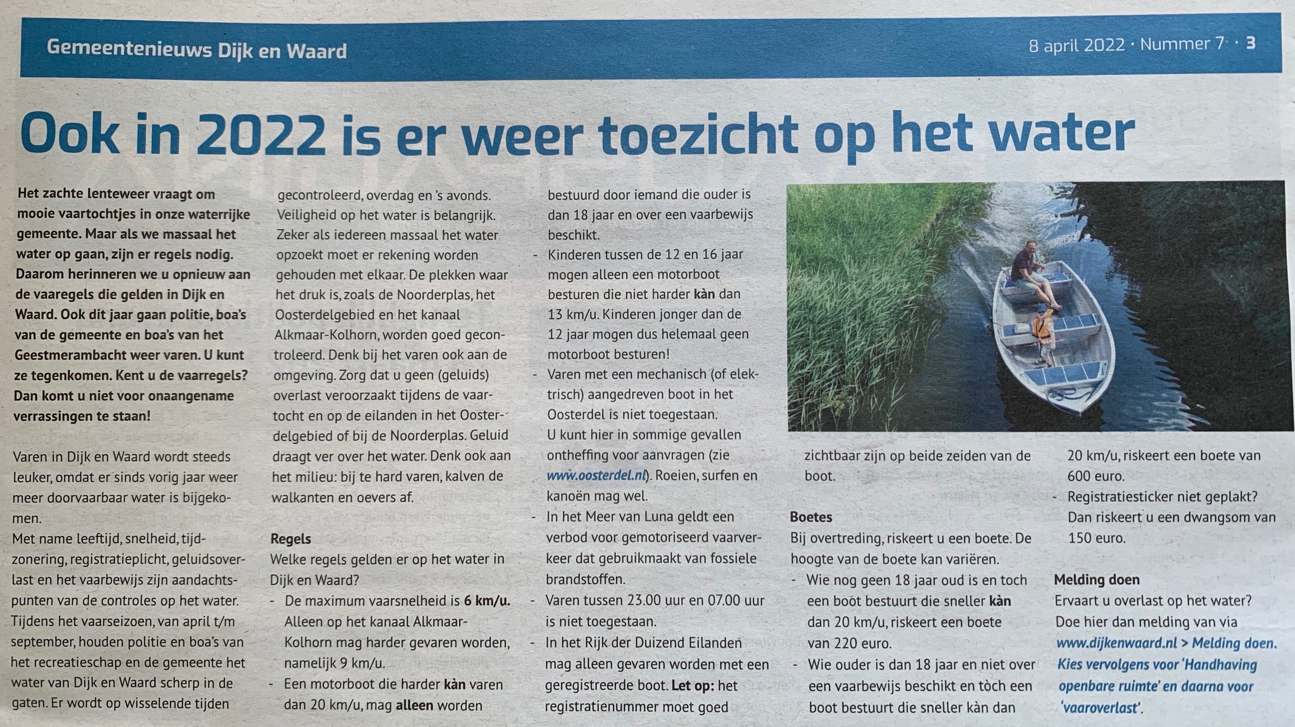 In de rubriek Gemeentenieuws in het Nieuwsblad Dijk en Waard van 8 april 2022 is een artikel te vinden over de regels en boetes voor het vaarseizoen 2022.
